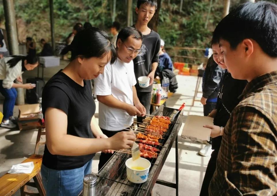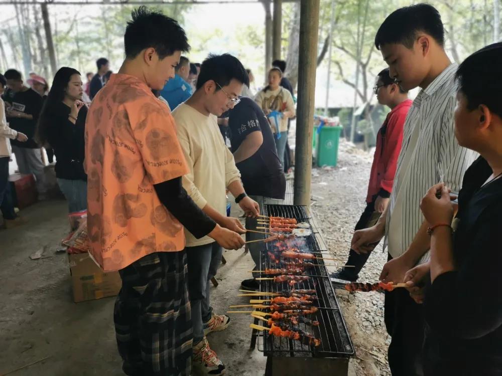忙碌而充實(shí)的上午稍縱即逝,中午開(kāi)始享受午餐,午餐準(zhǔn)備的是燒烤,配有小吃、水果、飲料、炒菜與米飯。大家自己動(dòng)手,分工明確,有穿肉串的,有刷油撒作料的,配合默契,隊(duì)伍里有燒烤達(dá)人,也有菜鳥(niǎo)小白,大家彼此相互借鑒學(xué)習(xí)燒烤經(jīng)驗(yàn),吃貨們也被彌漫周?chē)臒鞠阄兑每谒绷鳎沔椅倚?,同事間的情誼隨著縷縷炊煙逐漸升華。