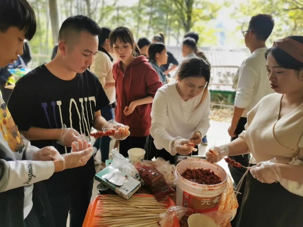 忙碌而充實(shí)的上午稍縱即逝,中午開(kāi)始享受午餐,午餐準(zhǔn)備的是燒烤,配有小吃、水果、飲料、炒菜與米飯。大家自己動(dòng)手,分工明確,有穿肉串的,有刷油撒作料的,配合默契,隊(duì)伍里有燒烤達(dá)人,也有菜鳥(niǎo)小白,大家彼此相互借鑒學(xué)習(xí)燒烤經(jīng)驗(yàn),吃貨們也被彌漫周?chē)臒鞠阄兑每谒绷鳎沔椅倚?,同事間的情誼隨著縷縷炊煙逐漸升華。